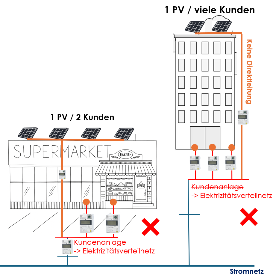 Abbildung 2: Direktleitung der jeweiligen PV Anlage an den jeweiligen Kunden (Supermarkt und Bäcker)
